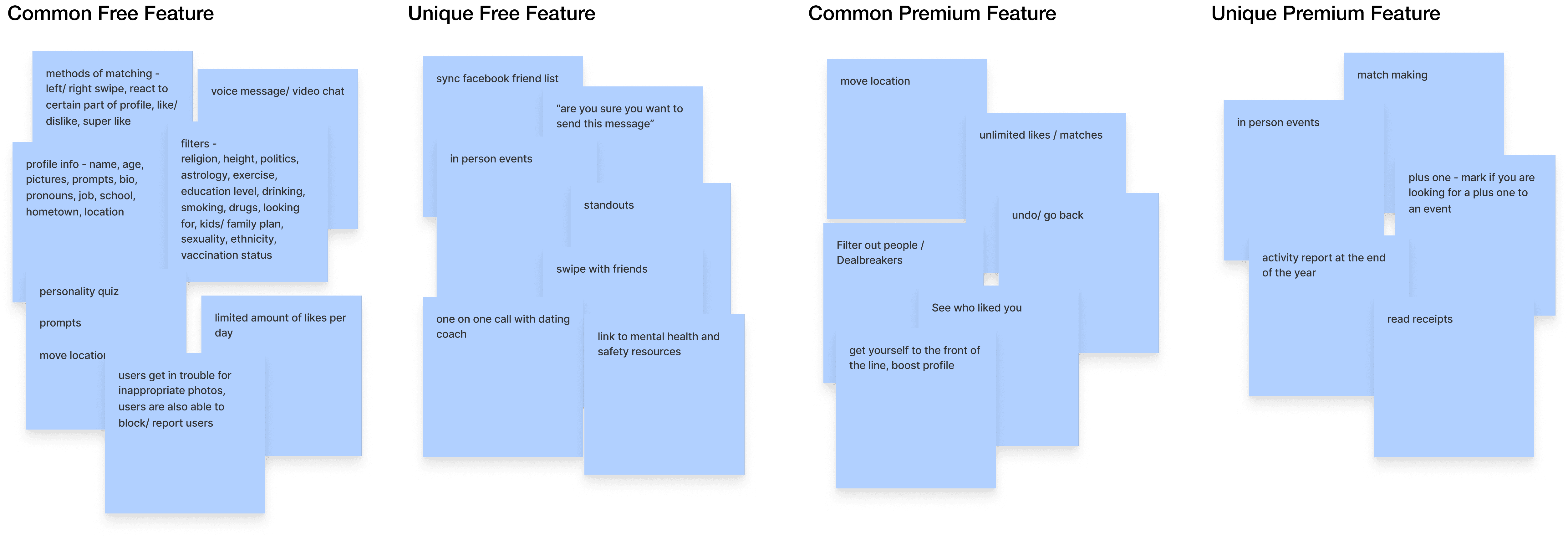 To better understand the dating app landscape, we conducted a competitive analysis of leading platforms including Hinge, Match, Tinder, and Bumble, as well as several niche apps. This process allowed us to identify patterns in both free and paid feature offerings—highlighting which features were considered standard across most apps, which were differentiators, and where opportunities for innovation might exist. Competitive analysis is especially critical in crowded markets like online dating, where user expectations are shaped by dominant players. By evaluating the strengths, weaknesses, and unique value propositions of existing apps, we were able to determine not only the “must-have” features for parity, but also potential white space where our product could stand out. This foundation ensured that our concept was informed by both industry norms and unmet user needs.