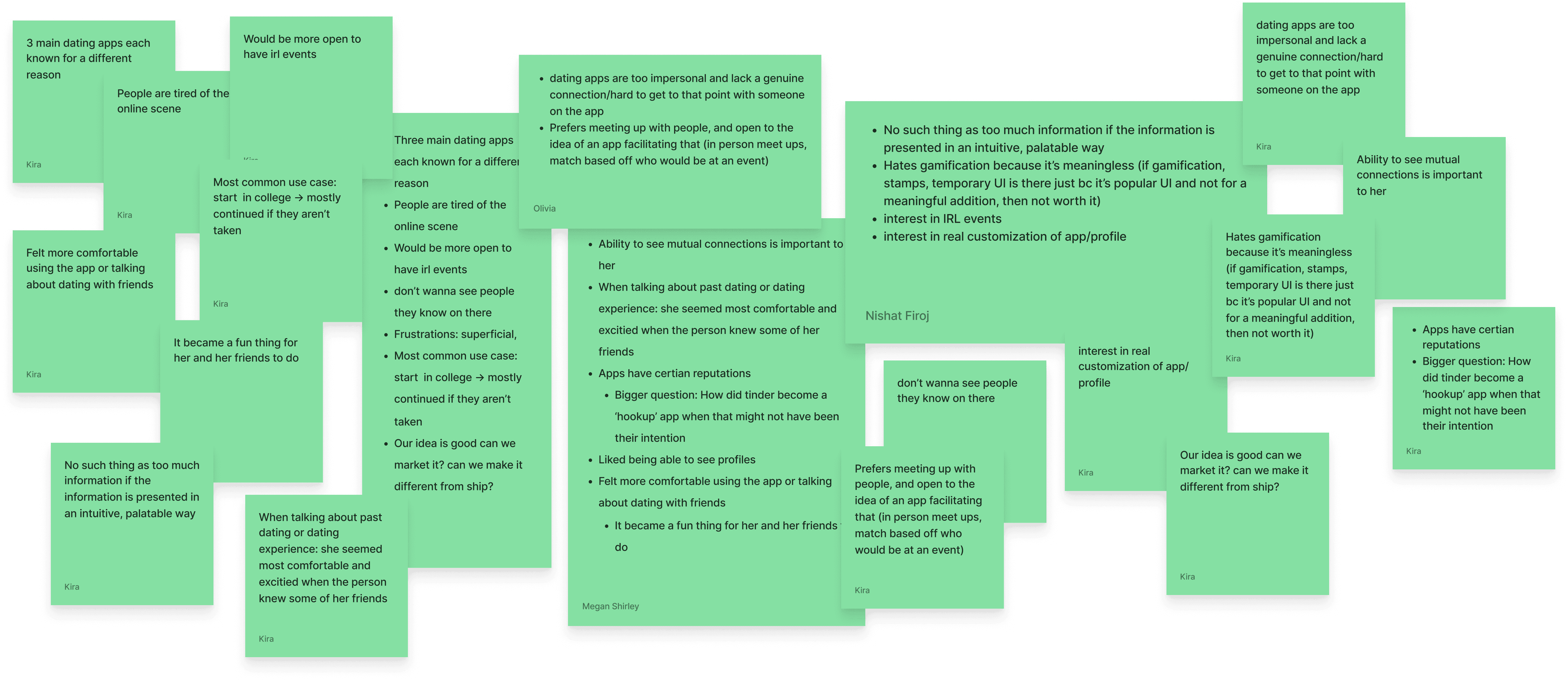 We conducted in-person interviews with several active dating app users to better understand their habits, preferences, and frustrations with existing platforms. Our goal was to uncover not only how users engage with dating apps, but also what underlying needs and desires remain unmet in the current market. We asked questions about dating habits, specific feature preferences, and their overall experiences navigating the online dating landscape. This qualitative research gave us valuable insight into how people perceive and use these tools in real life, and what opportunities might exist for a differentiated solution.
