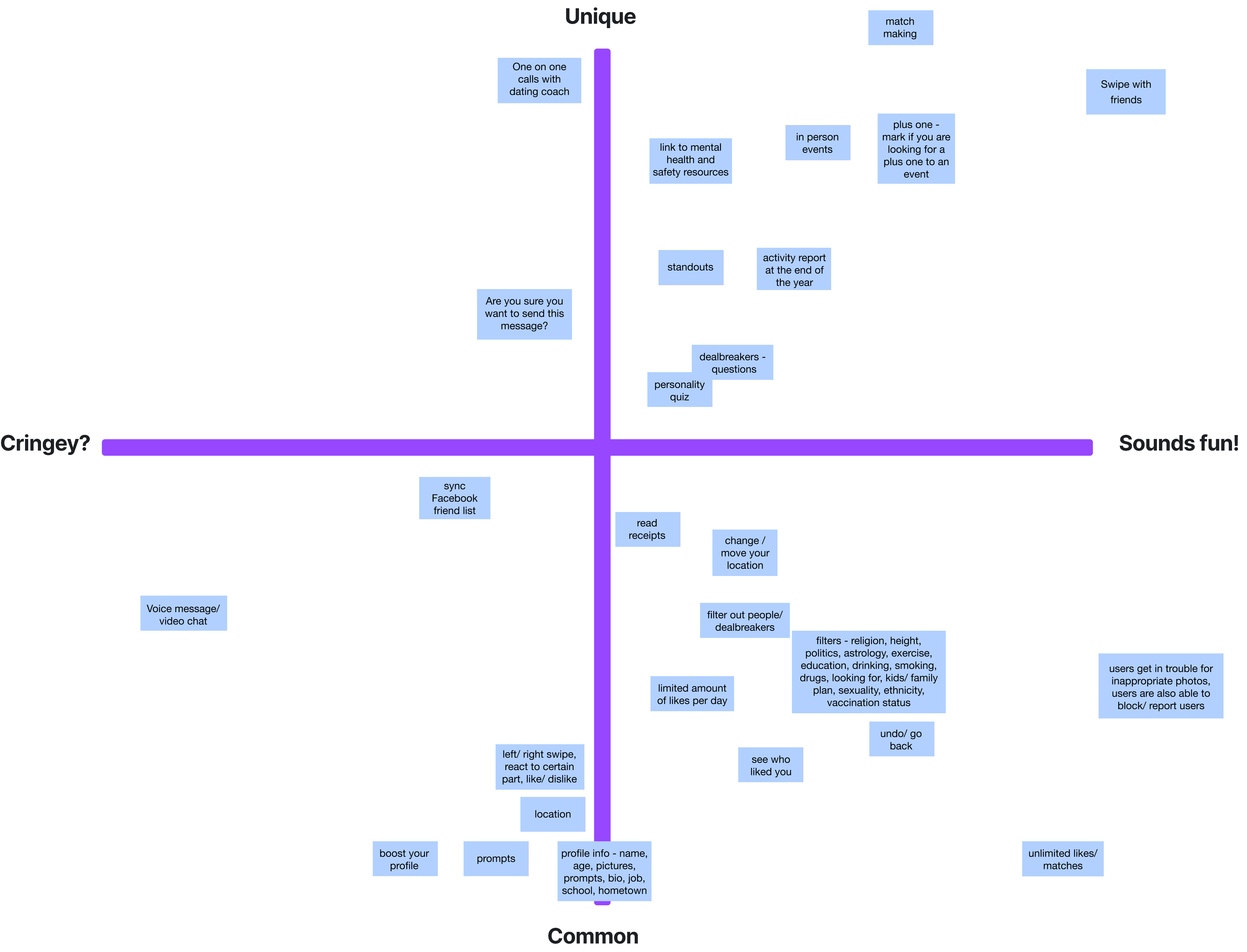 To synthesize our findings, we plotted features onto a two-axis chart to visualize their positioning within the market. The horizontal axis ranged from cringey to fun, reflecting how users might emotionally respond to a feature, while the vertical axis represented a spectrum from common to unique. By placing each feature along these dimensions, we created a visual map that highlighted clusters of overused features as well as gaps that revealed potential opportunities. This exercise gave us a clearer perspective on which features were table stakes, which ones risked being off-putting, and where we could differentiate by offering playful, innovative features that competitors had overlooked. Ultimately, the mapping process helped us prioritize features strategically, balancing user expectations with opportunities for delight and differentiation.