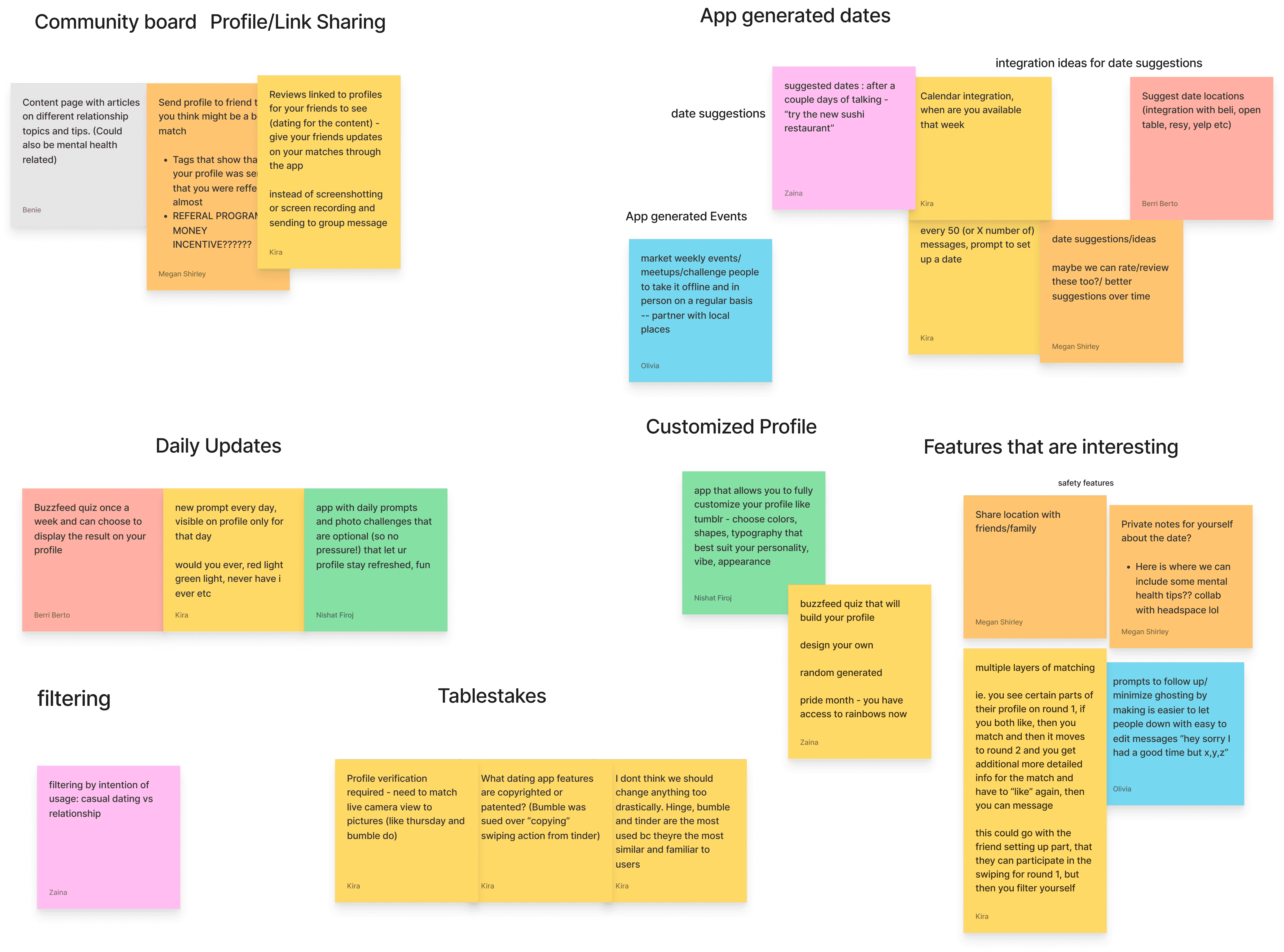 Once we had a large pool of ideas, we grouped them into themes such as profile customization, app-generated dates, safety features, daily prompts, and community-driven elements. This clustering helped us see patterns in our thinking and align on what felt most promising.