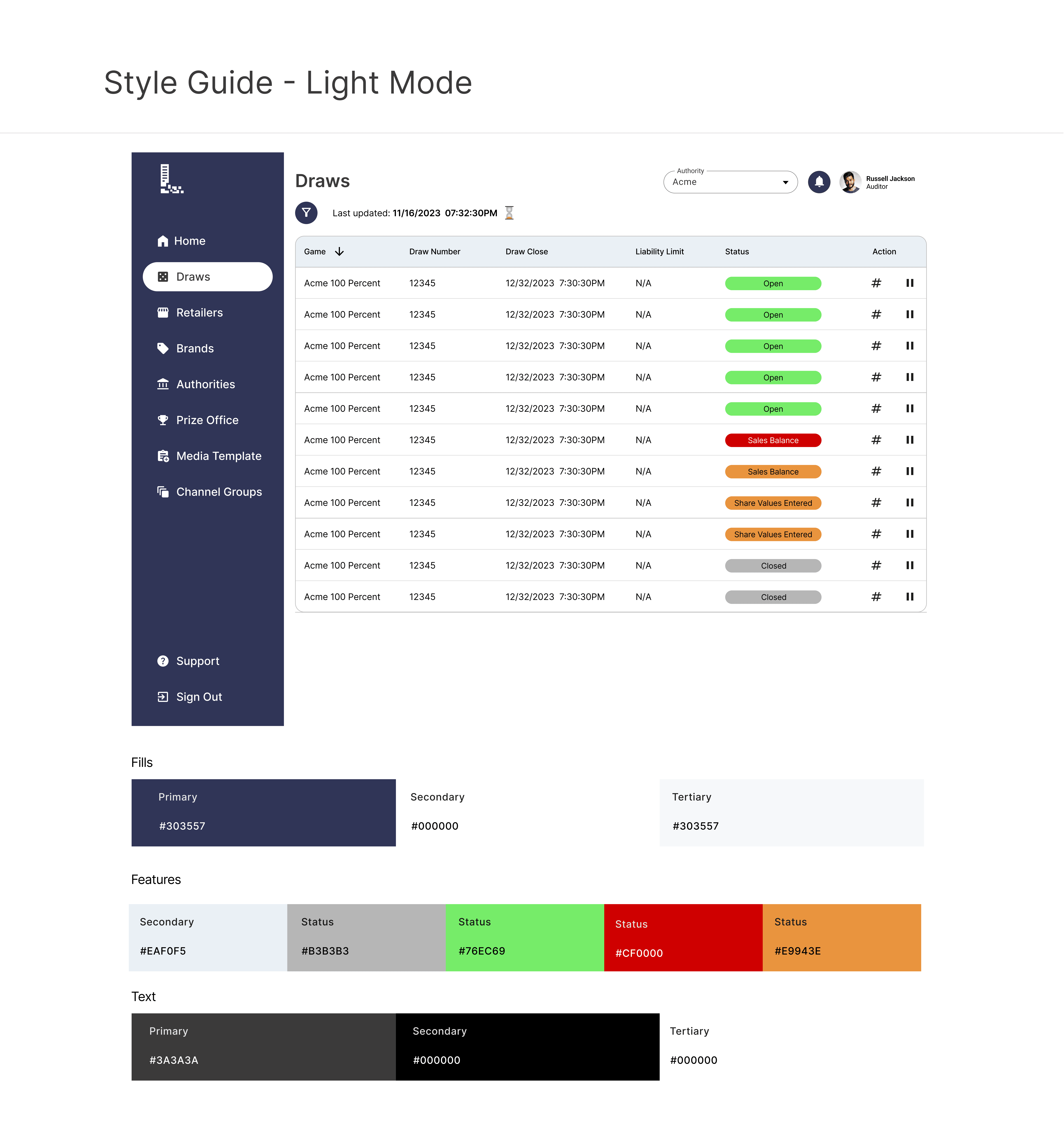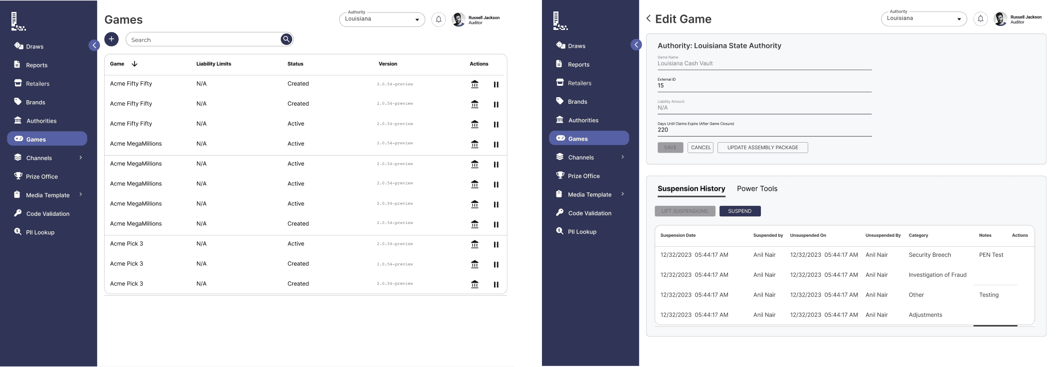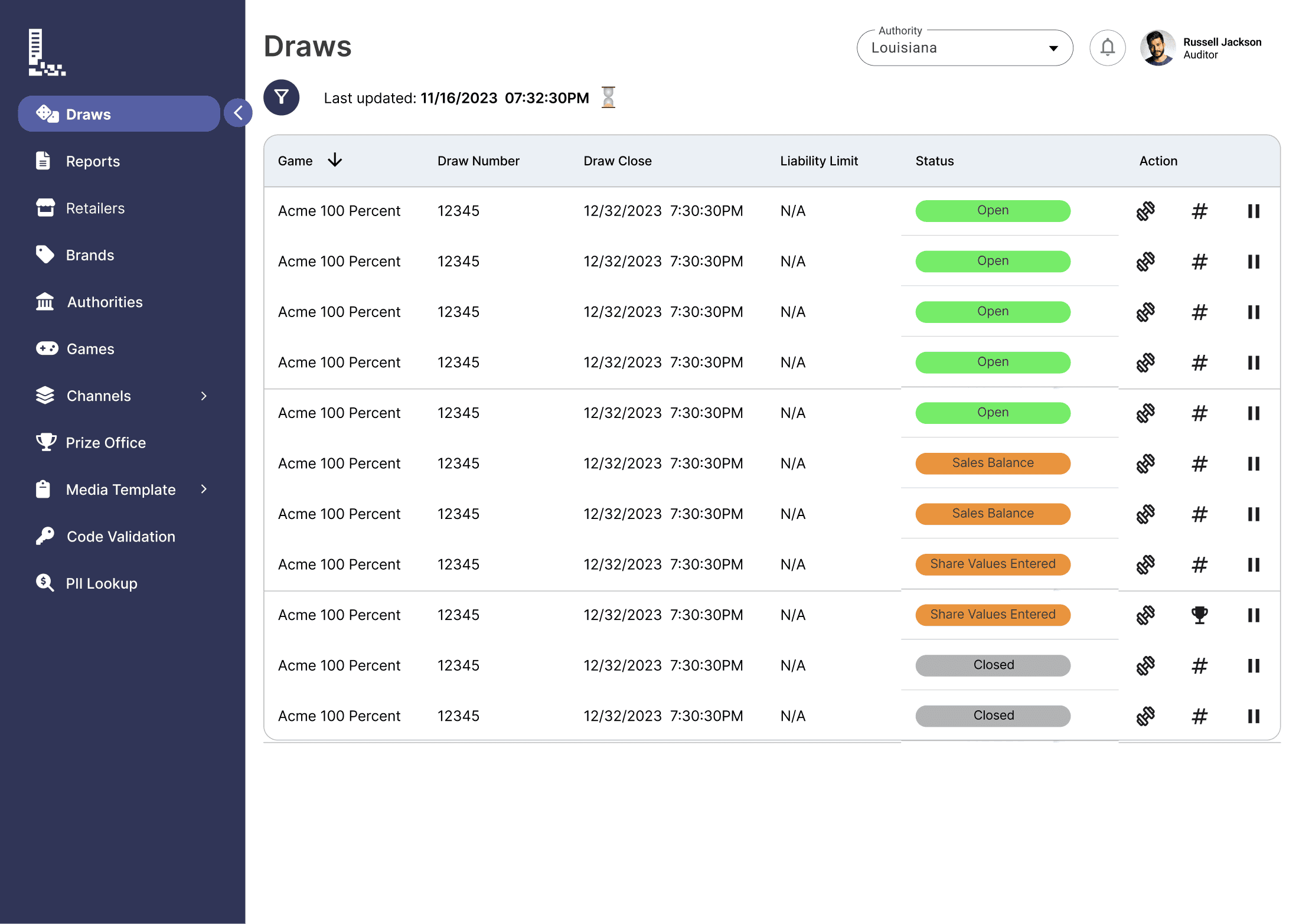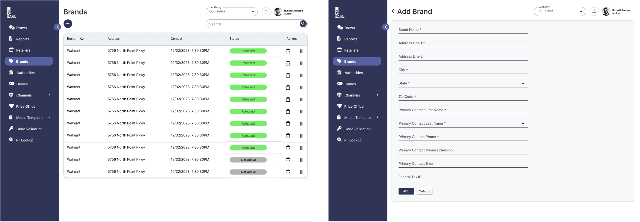 We took our findings and grouped them into two categories - Real Time Operations and Enterprise Operations and set out to make two separate products. The Real Time platform showed live sales, game updates, draw information and would host the necessary reports. The Enterprise platform would focus more on the back-end operations like setting up and managing Authorities, Retailers, Brands, etc.