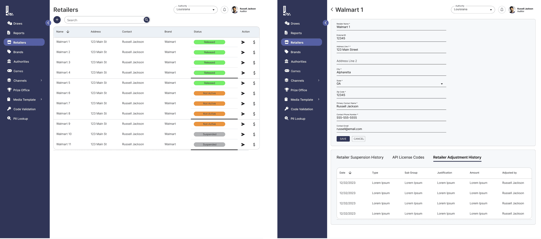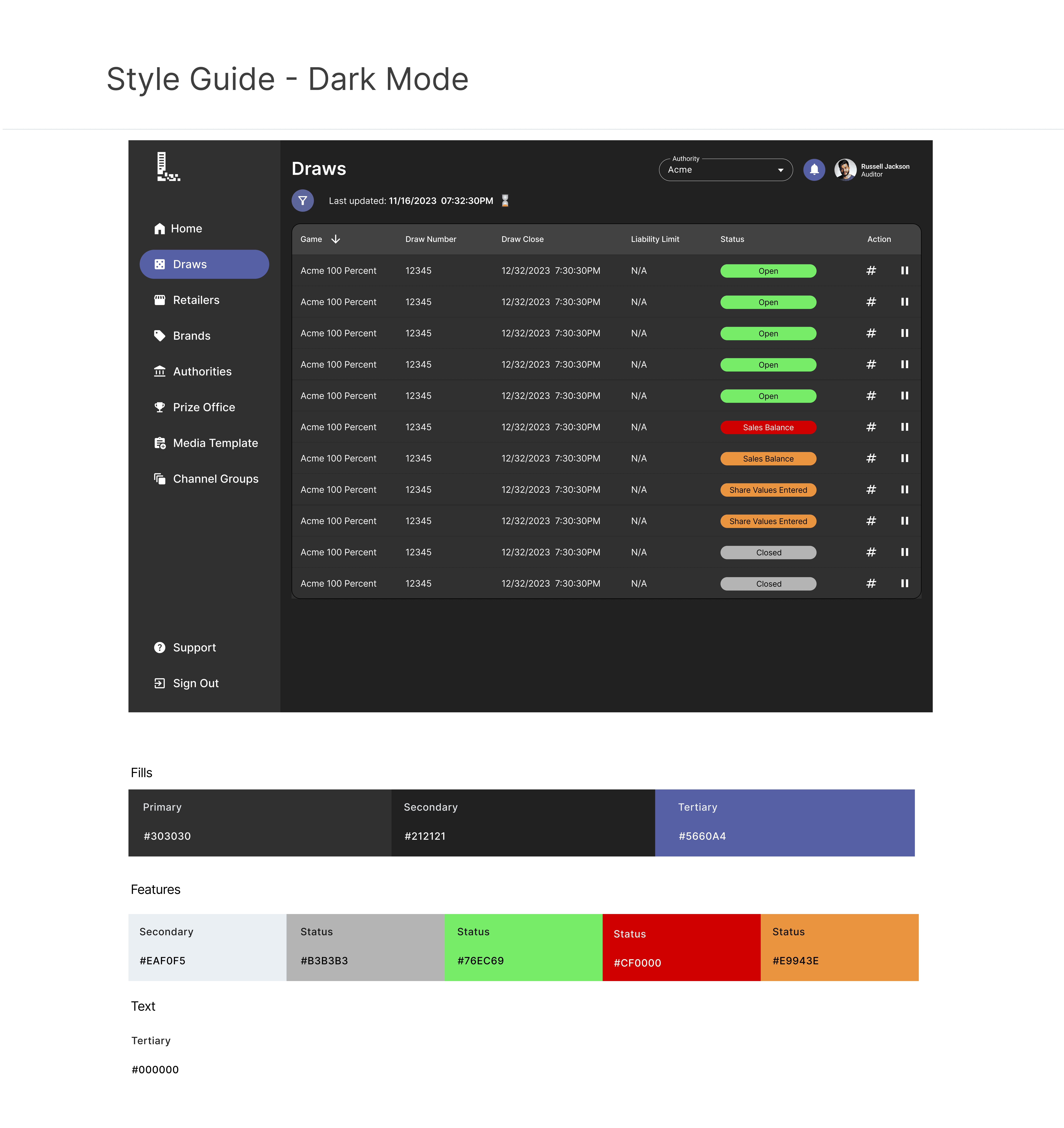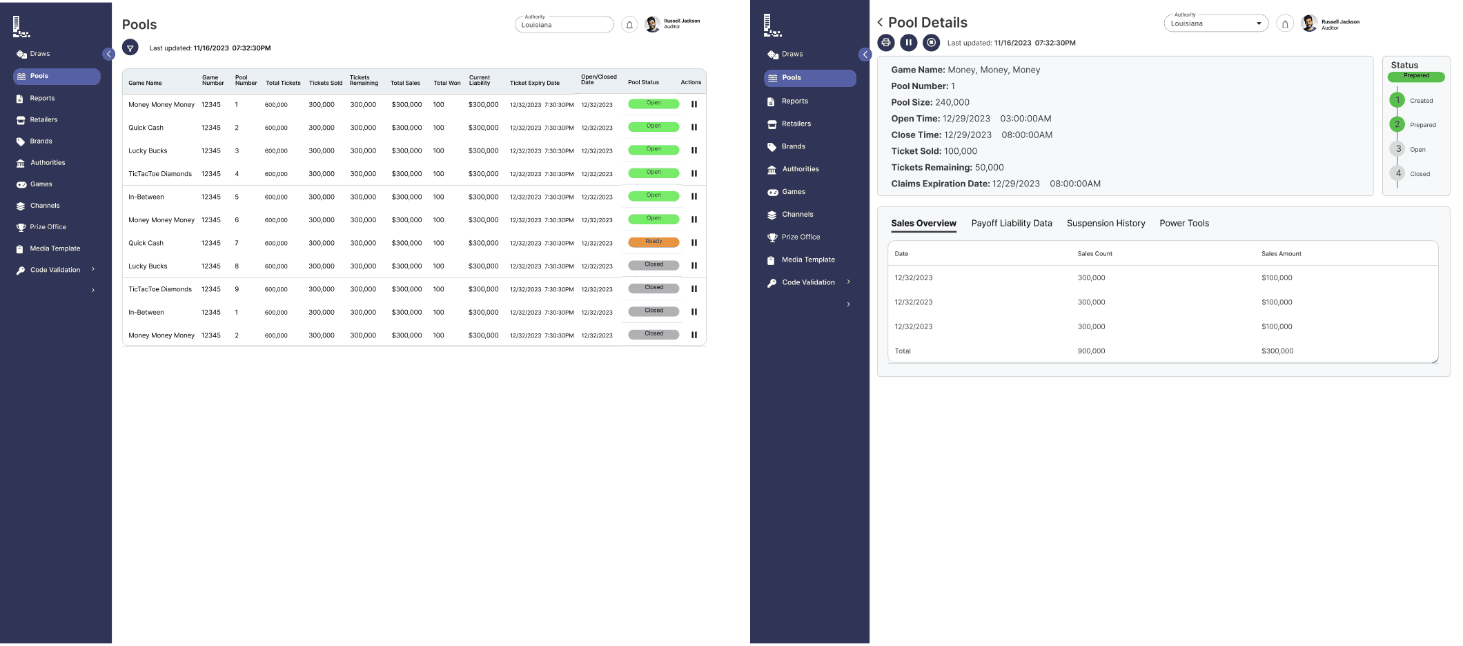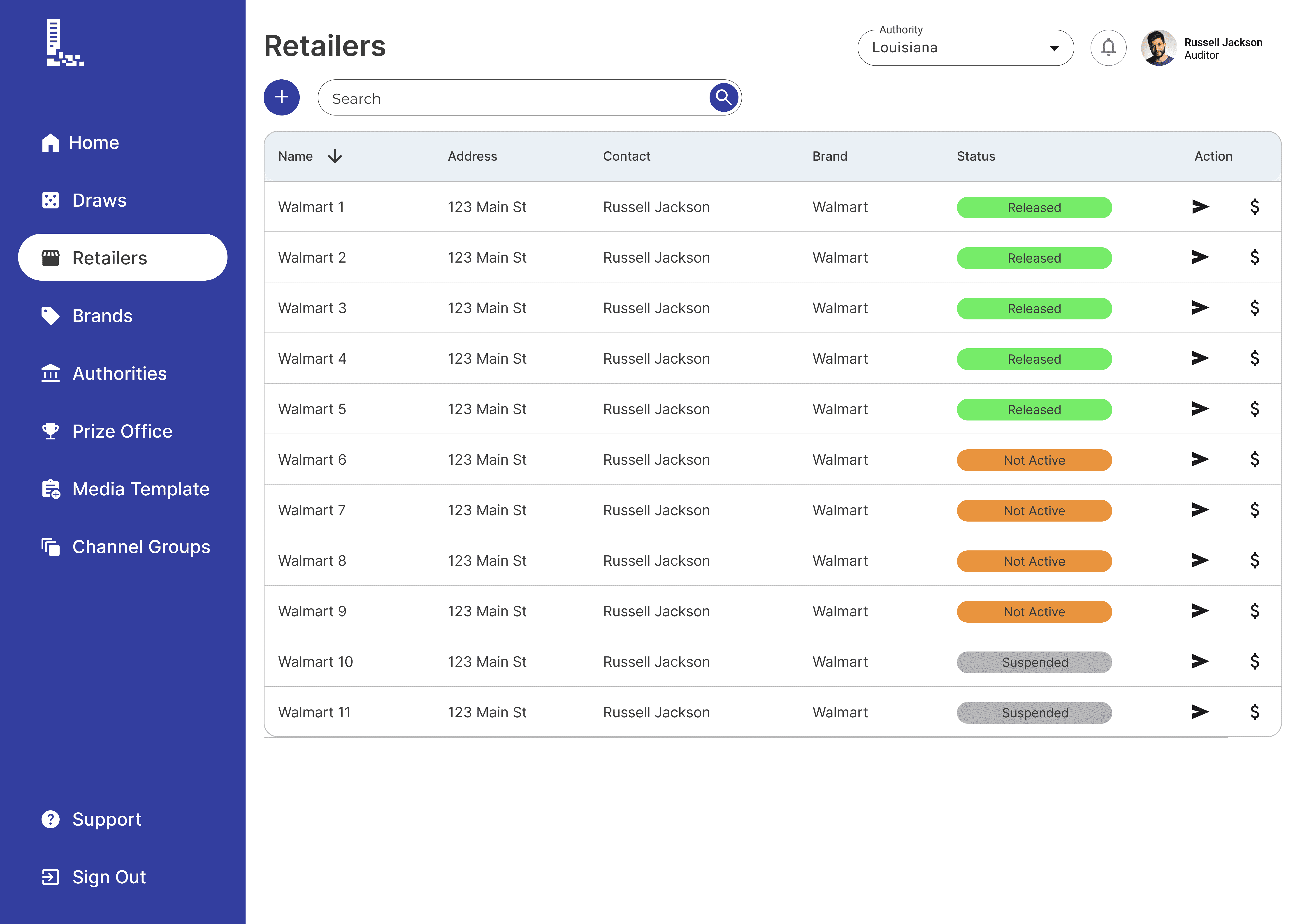 We took our findings and grouped them into two categories - Real Time Operations and Enterprise Operations and set out to make two separate products. The Real Time platform showed live sales, game updates, draw information and would host the necessary reports. The Enterprise platform would focus more on the back-end operations like setting up and managing Authorities, Retailers, Brands, etc.