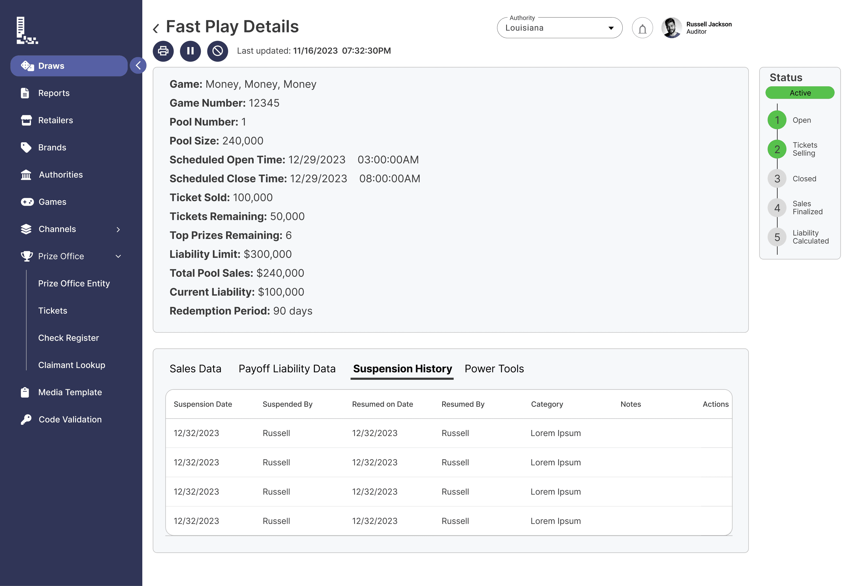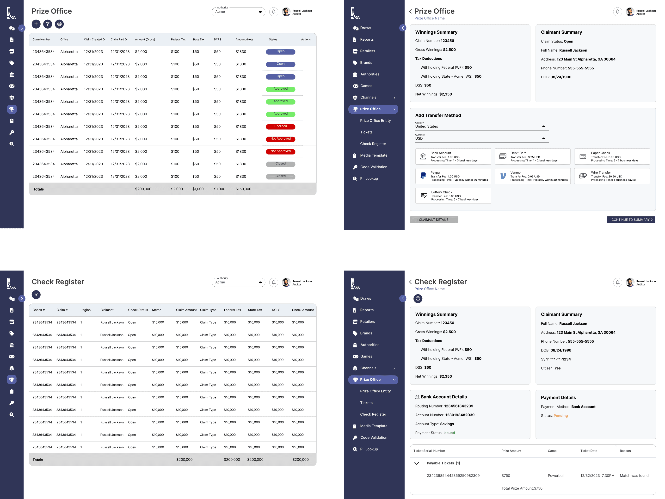 A big part of our Operations Portal is the Prize Office. This part of the system manages and verifies winning tickets and prize payouts. It acts as the claim control center, ensuring that all claims are processed securely, fairly, and in compliance with all regulations. Some core functions of the Prize Office are ticket validation, prize claim processing, balance and liability, audit and compliance and winner management. Here is a small snippet of the Prize Office we created for our Operations Portal.