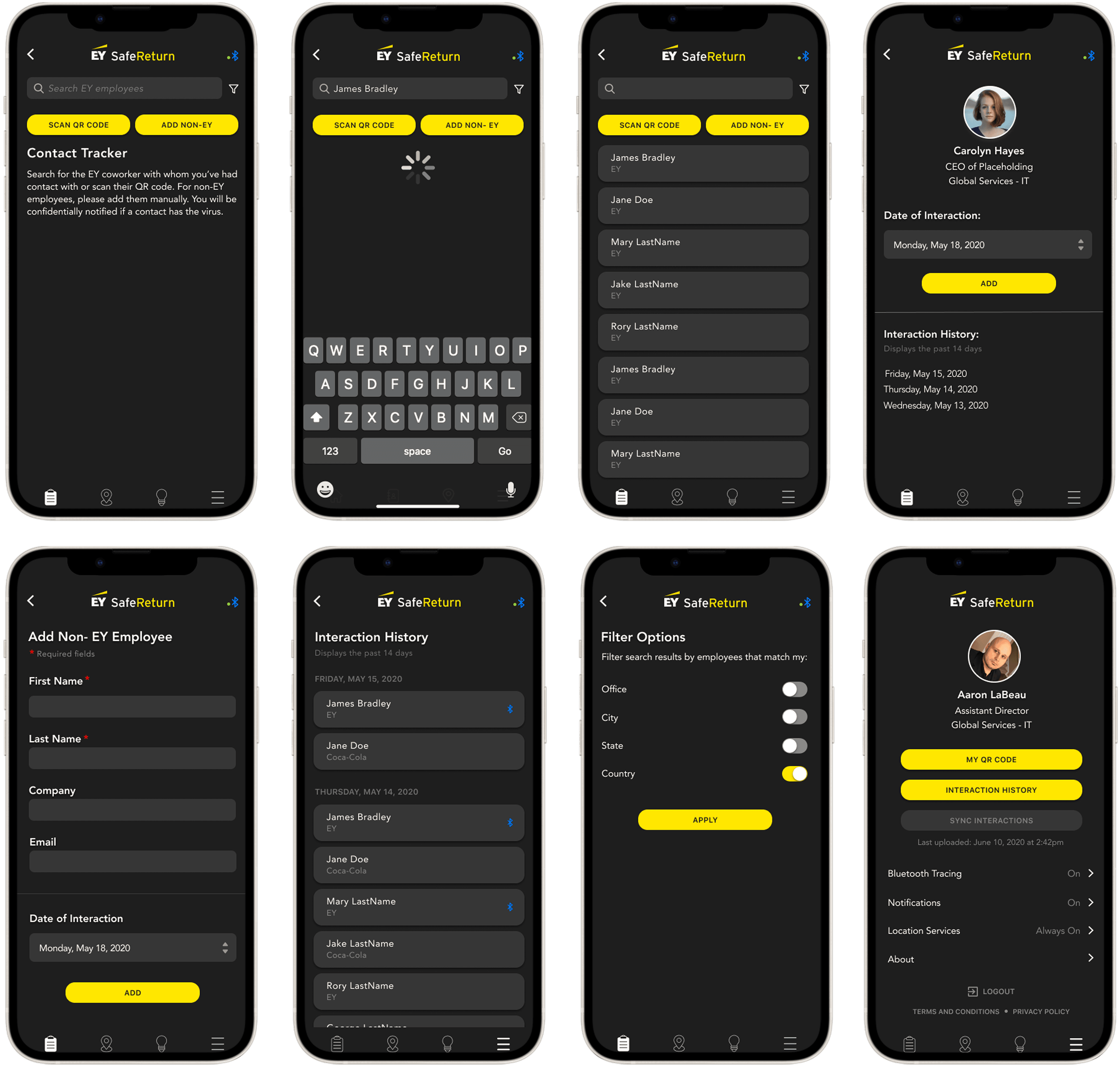 The app provided a secure and confidential contact tracing log that enabled employees to record interactions and receive immediate notifications if they had been exposed to someone who tested positive. For HR and operations teams, SafeReturn centralized tracking, reporting, and notifications in one tool, reduced administrative overhead while ensuring compliance with health and safety protocols.