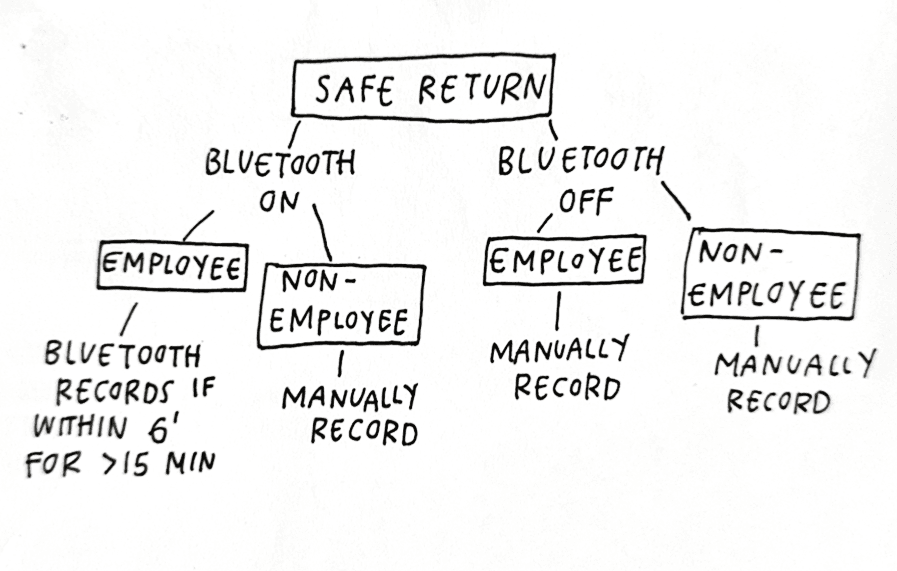 Before diving into design, we mapped out the different pathways of contact tracing to understand how users would interact with the app. Key decision points—such as whether a user enables Bluetooth and whether a contact is an internal or external employee—shaped the overall flow. This mapping informed the app’s architecture, ensuring we could design the most intuitive and seamless experience possible.