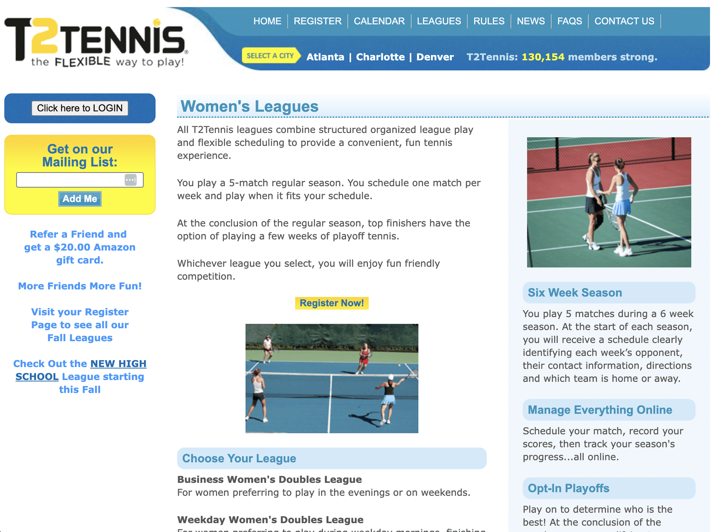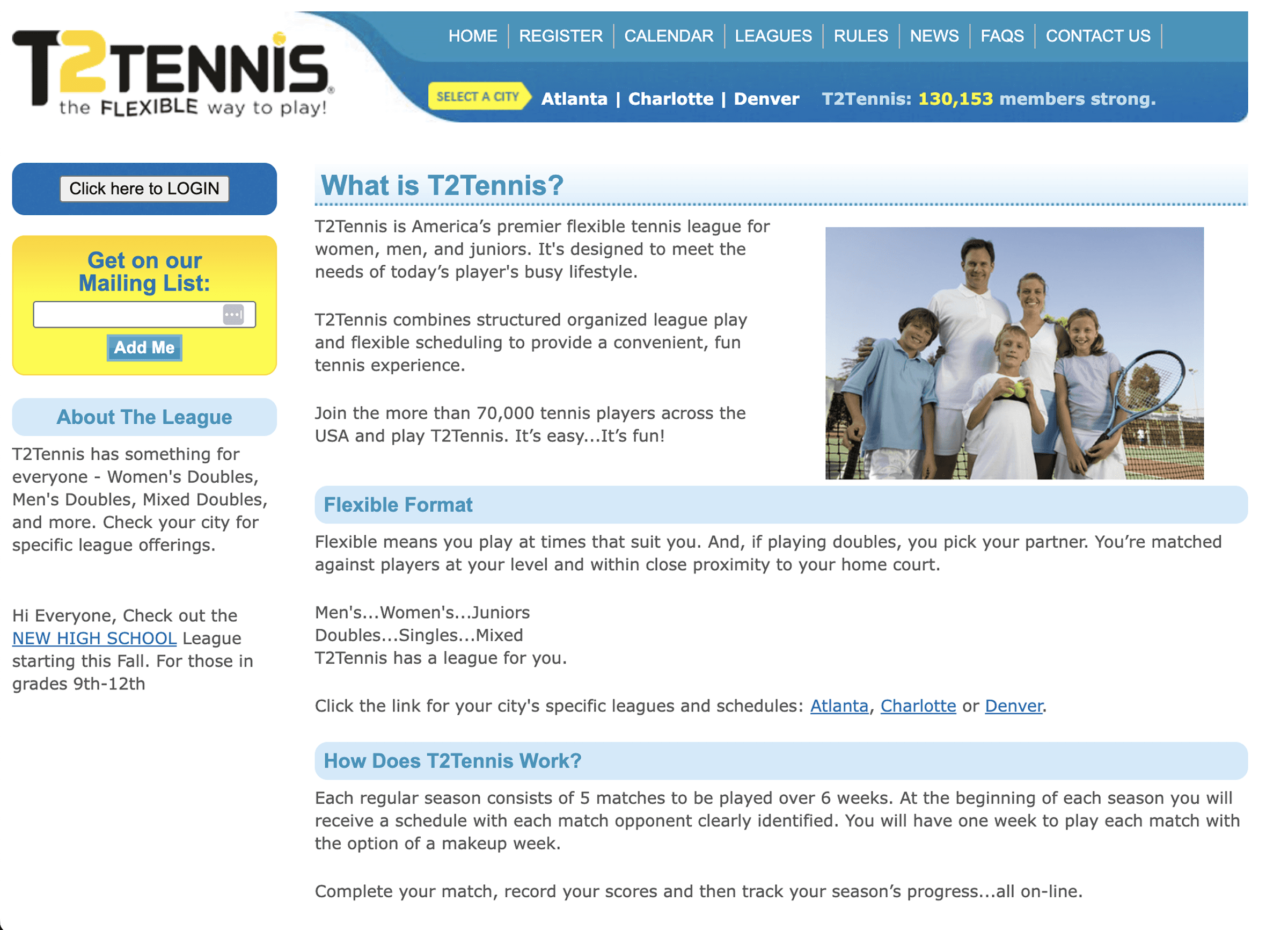 The existing T2Tennis website serves as a portal for players to register, view league schedules, access rules, and track their progress. While functional, the design feels dated and lacks the dynamic energy that reflects the vibrant tennis community it supports. The user interface is straightforward but could benefit from a more engaging and modern aesthetic to enhance user experience and better represent the brand's lively spirit.