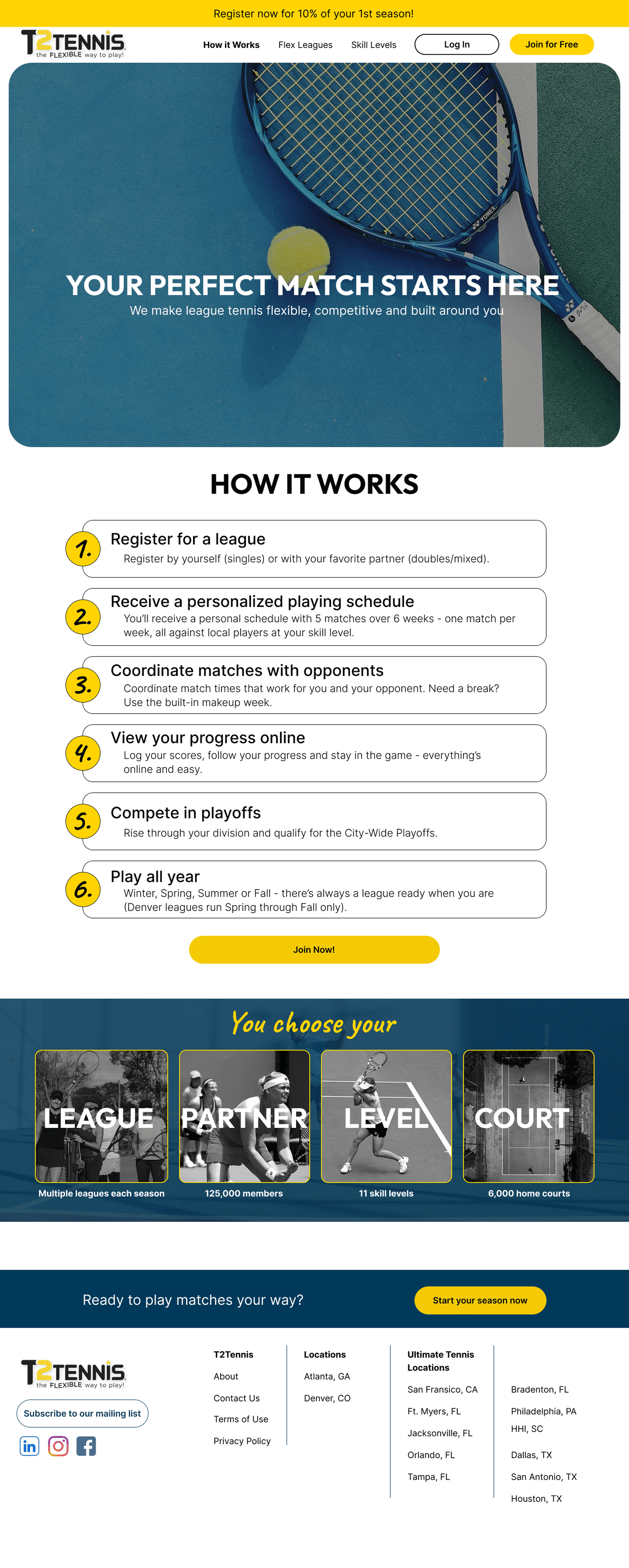 I was the sole designer on the project working as a freelancer. I collaborated with my stakeholder at T2Tennis to bring his vision for the redesign to life.