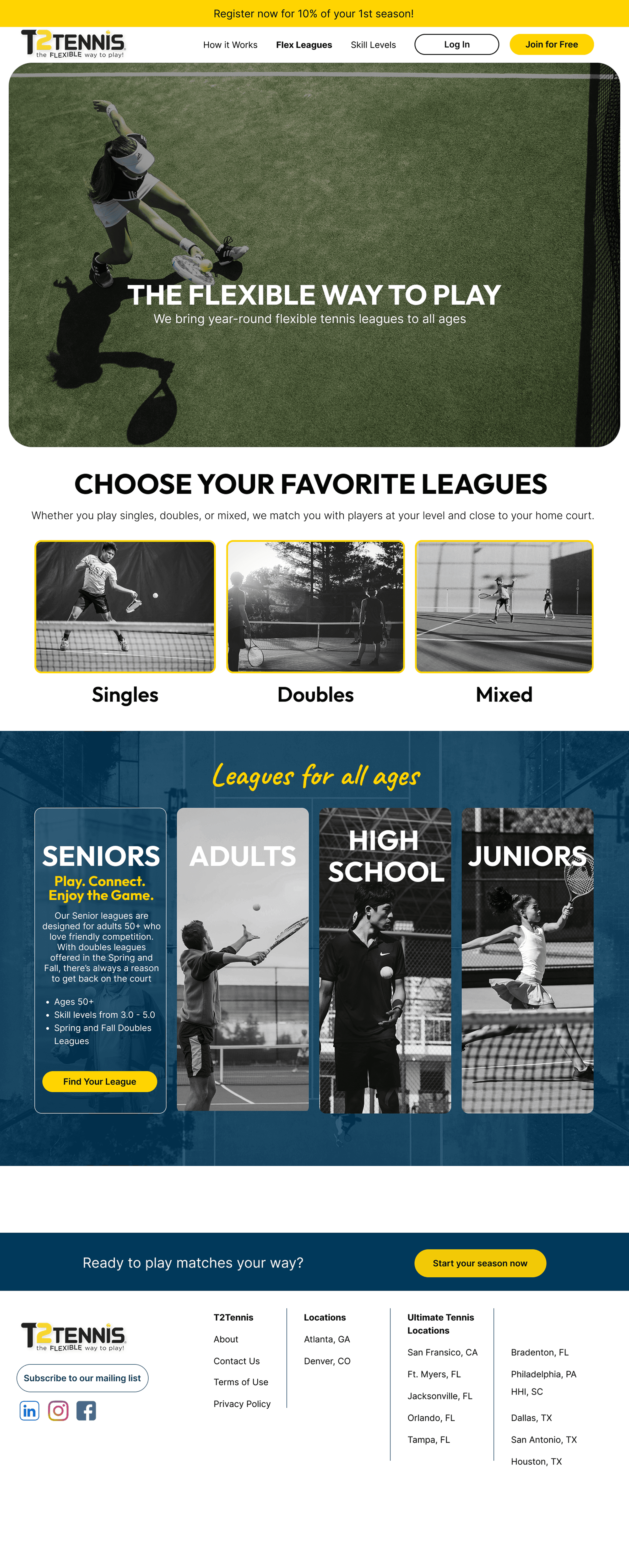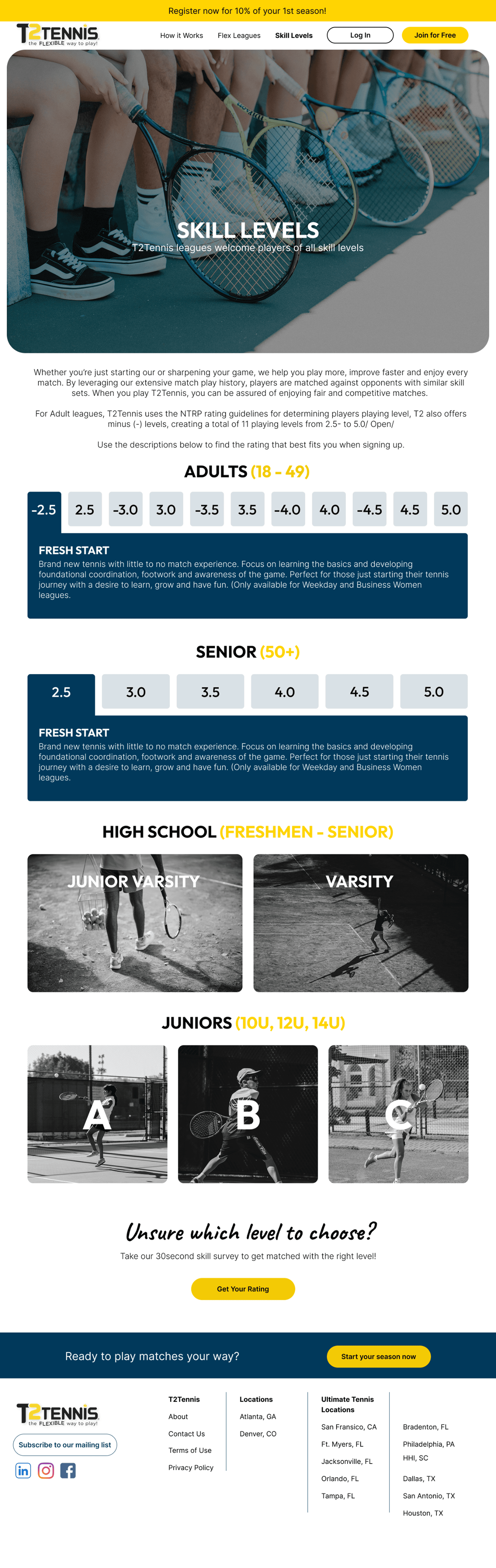 I am currently leading a comprehensive redesign of the T2Tennis website to transform it into a modern, visually exciting platform that better aligns with the dynamic nature of the tennis community it serves. The goal is to create an immersive digital experience that captures the energy and passion of the sport, making the website not only a functional tool but also an engaging destination for current and prospective players.