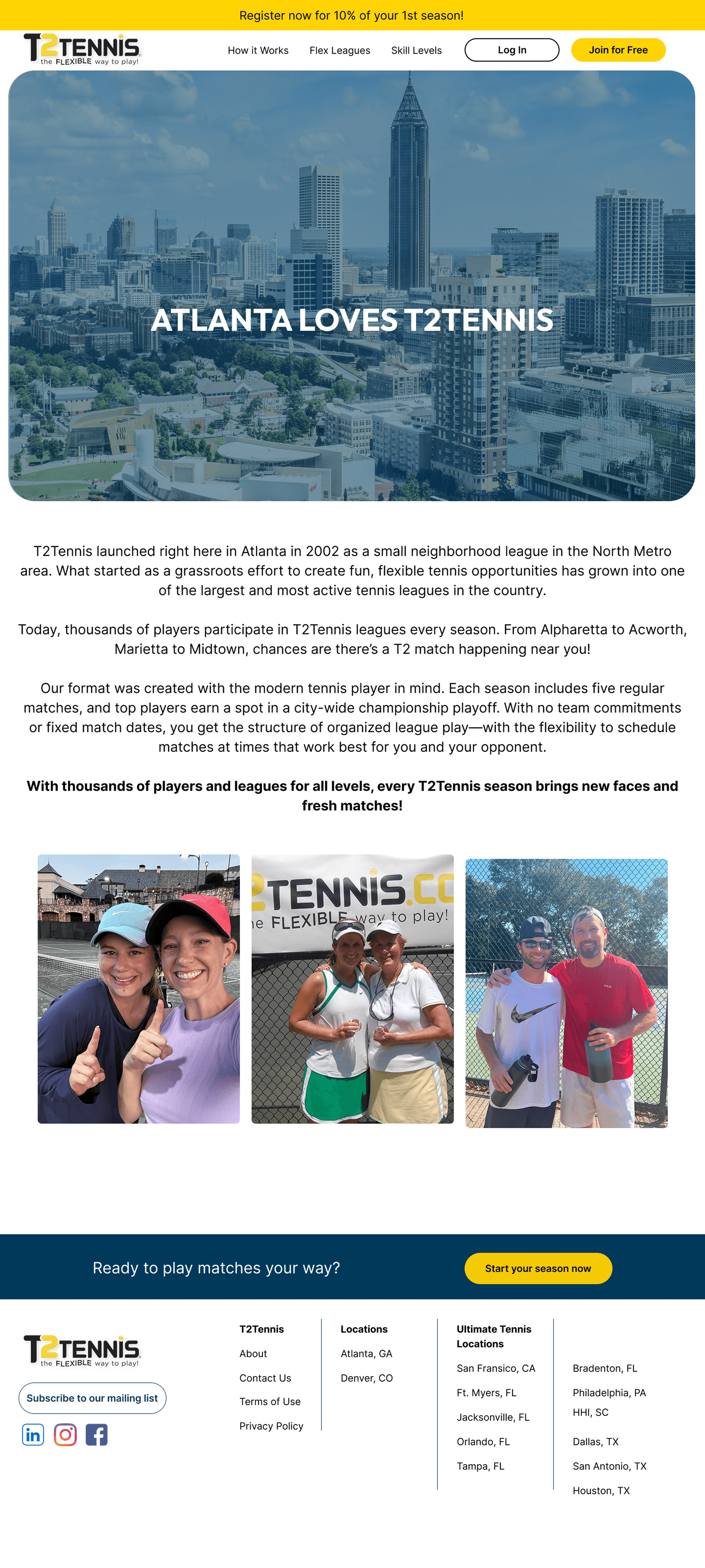 T2Tennis is America's premier flexible tennis league, catering to women, men, and juniors. Established in 2002, it has grown to serve over 70,000 players across more than 1,500 tennis facilities nationwide, with a strong presence in cities like Atlanta, Charlotte, and Denver. The league combines structured organized play with flexible scheduling, allowing participants to enjoy a convenient and fun tennis experience that fits into their busy lifestyles.